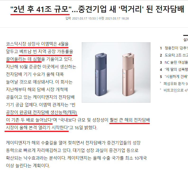 실제로 이 기준으로 상상인증권 리포트에서는 이엠텍에 대해 "전자담배 매출만 회사에서 사업한다 가정하더라도 PSR3배를 주면 회사의 시총은 6000억, 즉 주가는 37400원이 되어야 하며, 이는 Smoore International이 PSR40, relx Technology PSR20에 비했을 때 굉장히 PSR을 적게 주더라도, 현재 주가는 미친 저평가 상태"라고 평가하고 있습니다.