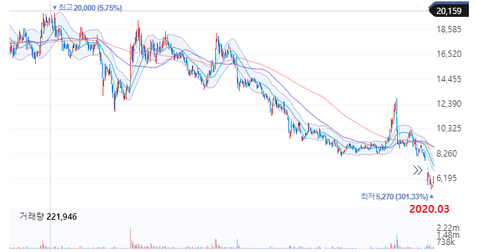2018.7월 2만원을 기점으로 하여 2020년 3월 코비드19 언더슈팅까지 1/4토막인 5천원까지 가게 되죠.