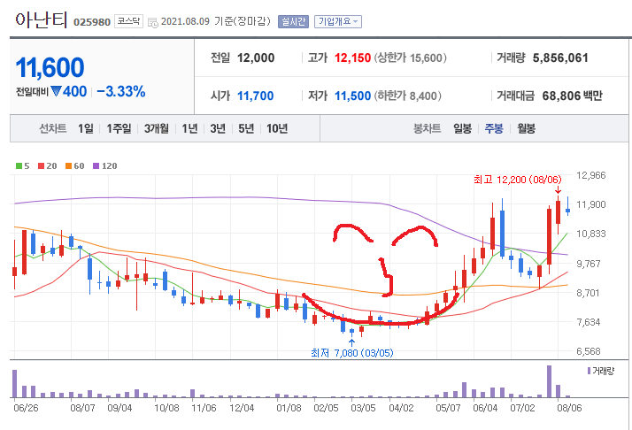 며칠 전 경협주 급등 당시에 시세를 분출하는 모습이며, 이후 5일선을 타고 가는 모습이 아난티와 흡사합니다.